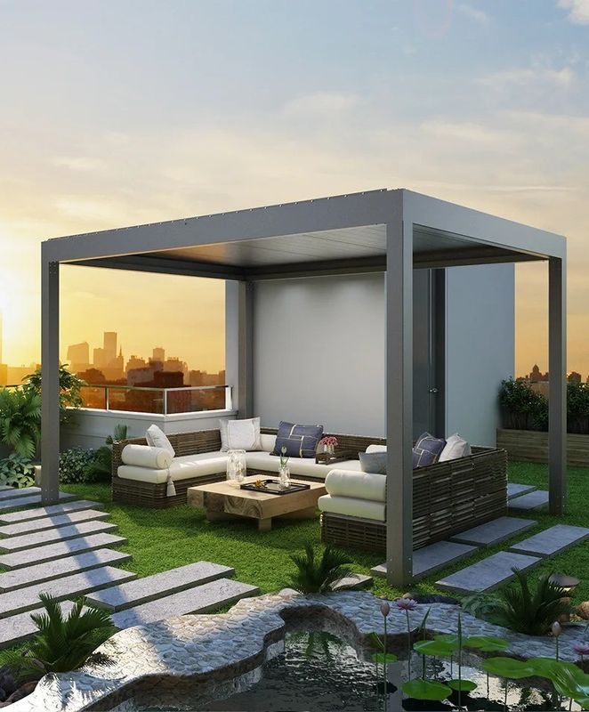 Stel je voor dat je wakker wordt, je koffie pakt en je aluminium paviljoen met lamellen instapt. Met een druk op de afstandsbediening kantel je de lamellen tot 45°—genoeg om zacht ochtendzonlicht door te laten, maar niet te veel om op je boek te schijnen. Het donkergrijze aluminium frame past bij het bedauwde gras en de bloeiende bloemen, waardoor een serene start van je dag ontstaat. In tegenstelling tot paviljoens met een vast dak die warmte vasthouden of open patio's die je blootstellen, kun je met de verstelbare lamellen het perfecte licht “instellen”. En omdat het van aluminium is, hoef je je geen zorgen te maken dat ochtenddauw het frame vochtig of roestig maakt.